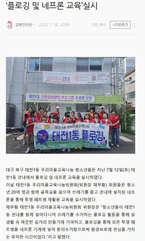 (보도자료) 북구 태전1동 플로깅 & 네프론 교육