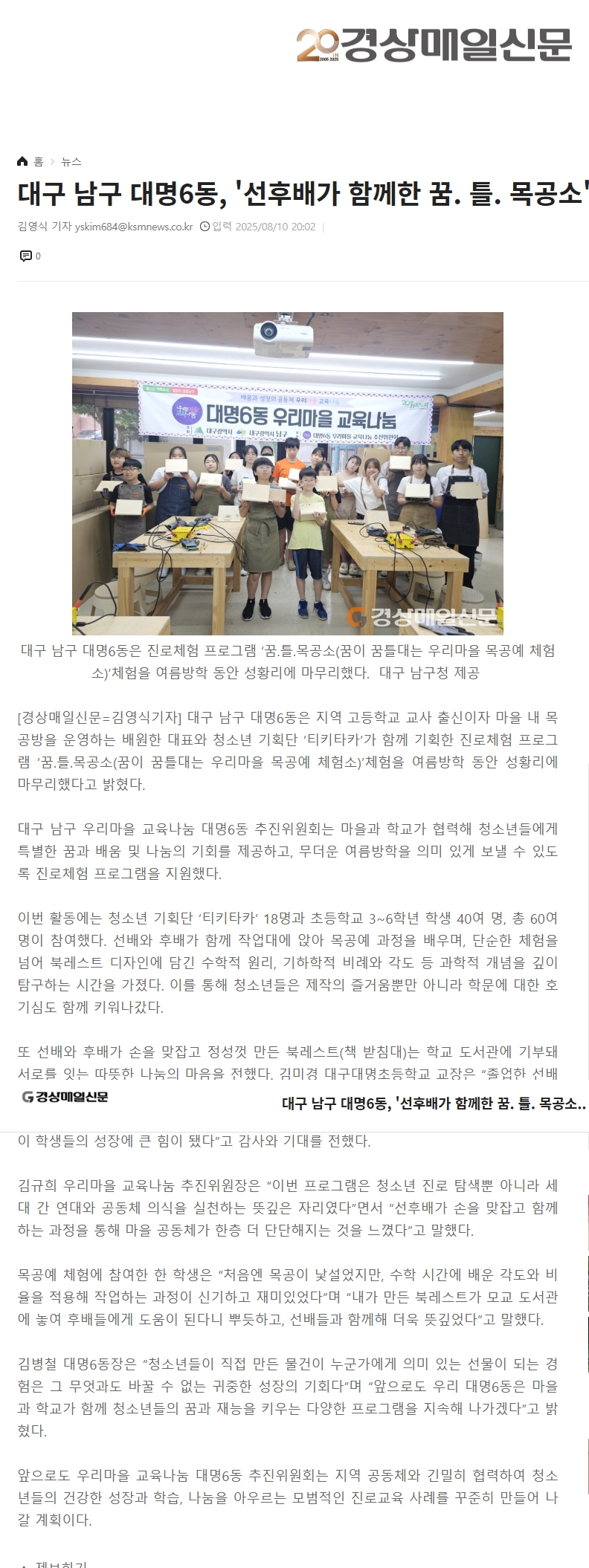 언론보도(경상매일신문) 대명6동 꿈틀 목공소