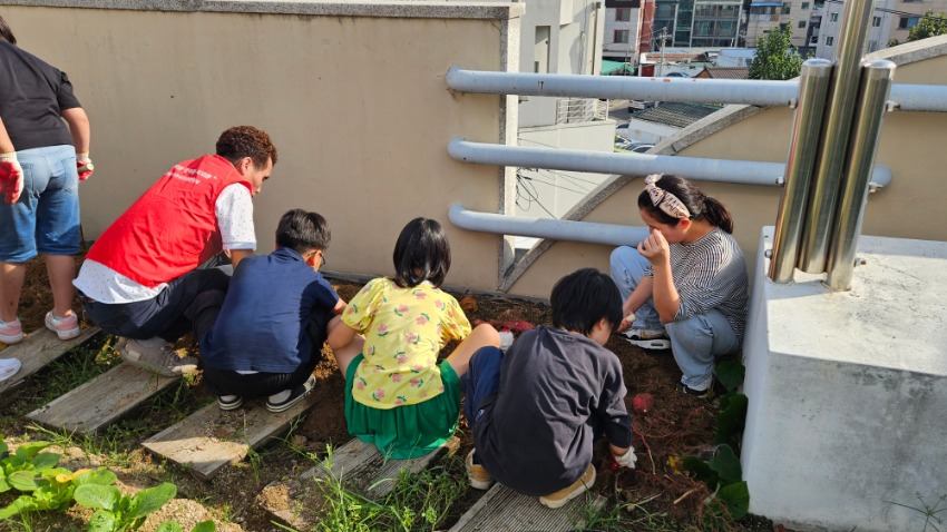무럭무럭 자란 고구마를 손수 수확하며 자연의 소중함도 함께 느낄 수 있었는데요, 이번 체험은 동인동 동장님께서 특별히 옥상을 개방해 주셔서 가능했던 소중한 자리였습니다.