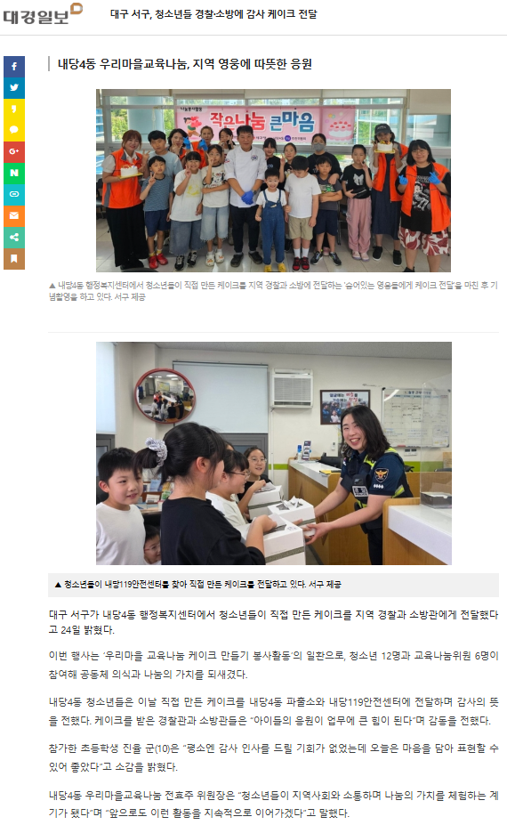 [대경일보] 대구 서구 내당4동 우리마을 교육나눔, 청소년들 경찰.소방에 감사 케이크 전달