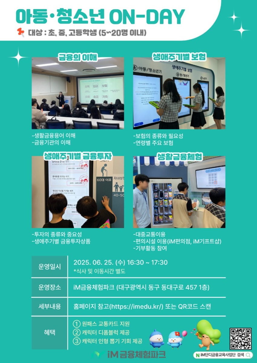 프로그램명 : JOB아드림 :직업체험 일 시:2025. 6월25(수) 16:00 - 19:00 (체험은 약1시간 소요되며 이동 시간과 식사 시간 포함) 대 상: 초등 4학년~6학년 (선착순 10명) 신 청 방 법 : 댓글(이름/학교학년/연락처) 내 용: 국내최초 금융복합체험공간 iM금융체험파크와 함께하는 ON-DAY 프로그램 장 소: IM금융체험파크 (상공회의소 빌딩 1층 ) (함께 갑니다~집결: 16:00 복지관1층) 이동: 도보 (5~10분)
