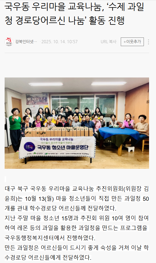 보도자료_북구 국우동 수제과일청 경로당 어르신 나눔 활동